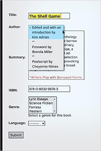 Two excellent examples of hermit crab essays that my students have enjoyed reading and using as models for their own work are Dinty Moore’sSon of Mr. Green Jeans” and Brenda Miller’s essay “We Regret to Inform You.” Moore presents a reflection on his troubled relationship with fatherhood in the form of an alphabetical index of terms. Miller frames a number of life’s disappointments as a series of rejection letters. Both of these essays are included in an anthology edited by Kim Adrian titled The Shell Game: Writers Play with Borrowed Forms.