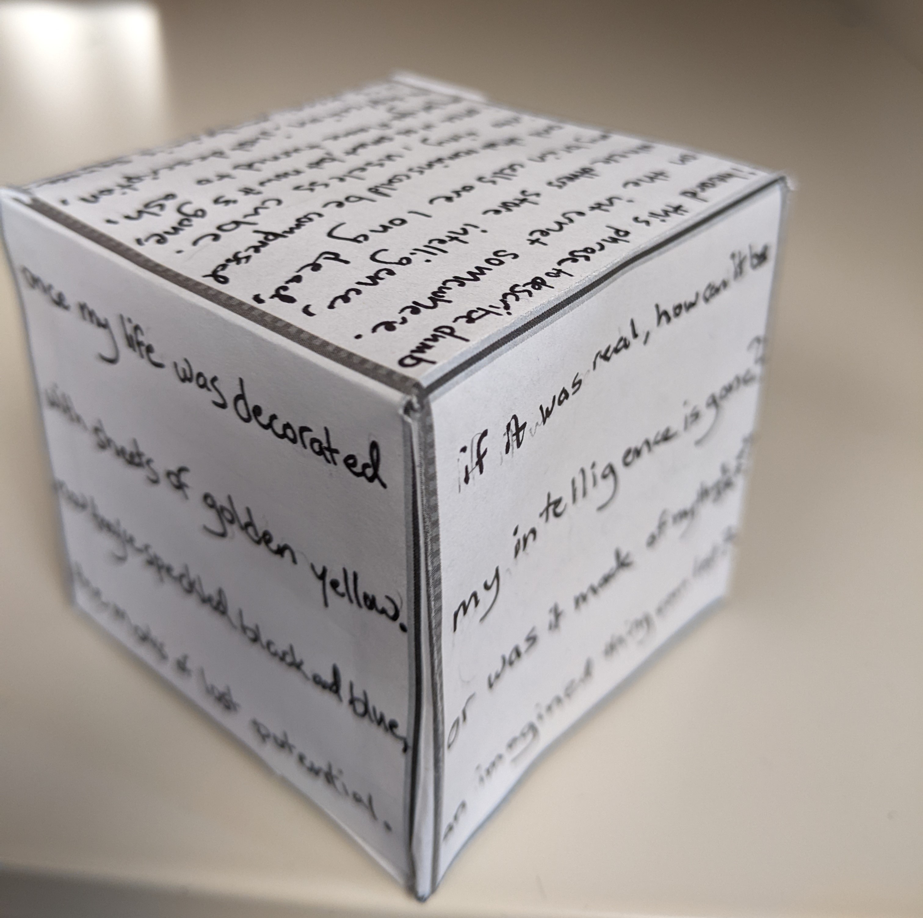 One day after class, the student handed me a paper cube with her revised poem written on its surfaces. She explained to me how she had re-imagined her message in three dimensions and how she had decided how to place the words on the cube.